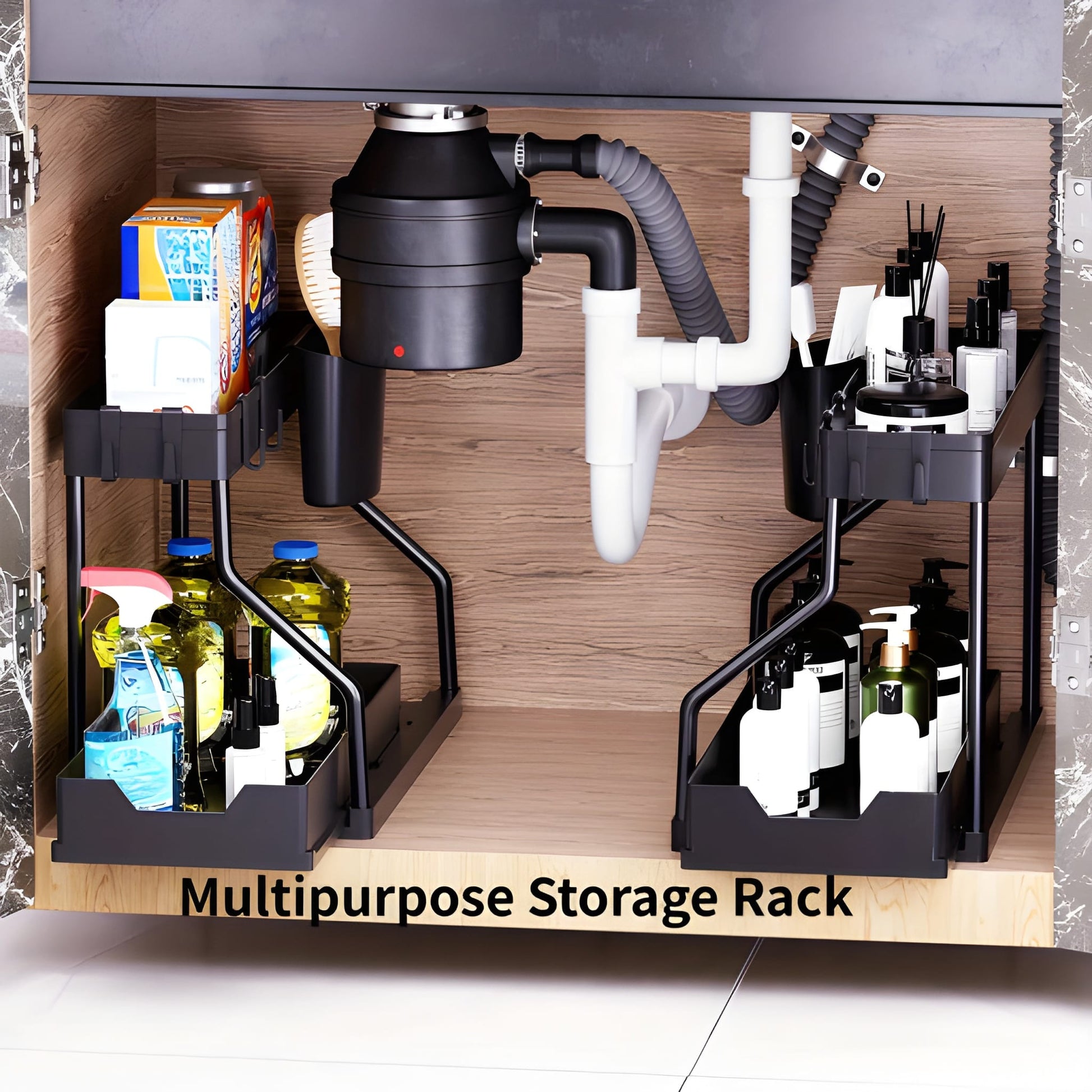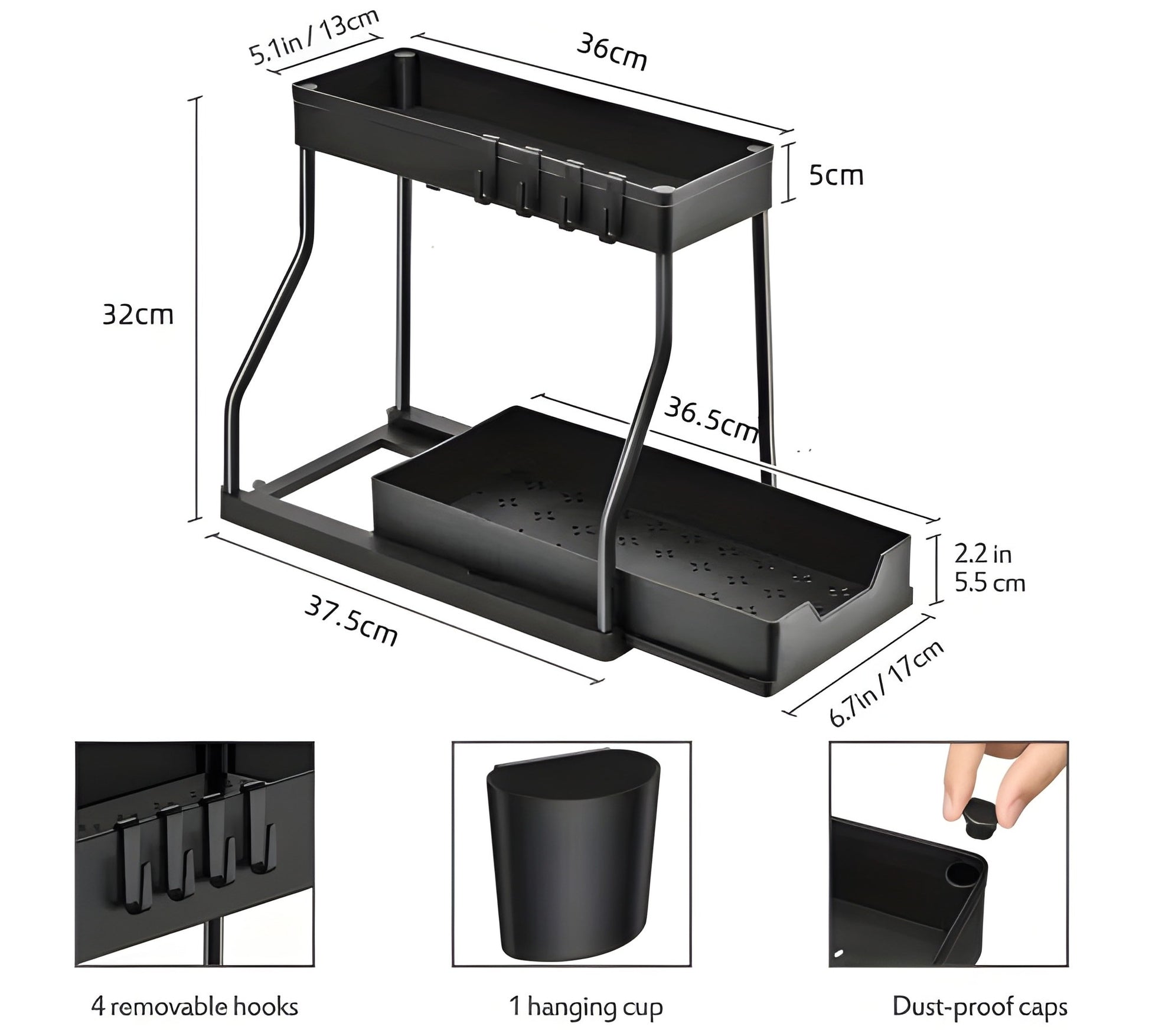 Sfrutta al meglio ogni centimetro del mobile sottolavello con questo pratico organizer a due ripiani. Perfetto per detersivi, spugne, spray, bottiglie, carta casa e tanti altri accessori, ti aiuta a mantenere tutto in ordine e facilmente accessibile.